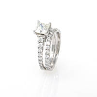 Princess-Cut Eternity Wedding Set - 14K white gold, set with a 1.21 carat princess-cut center diamond, and brilliant-cut surrounding diamonds totaling 0.92 carats.
